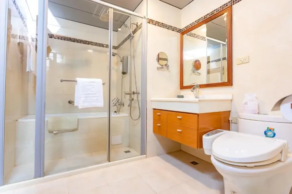 Inside the bathroom in the room (there is no hot water in the separate shower room), but it’s a hot day, please pay more attention when inspecting (it’s a bit unexpected because the beds were not tidyed for two nights and the next day…)